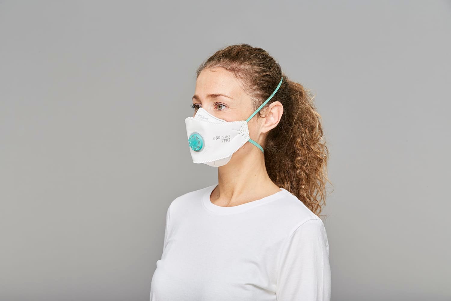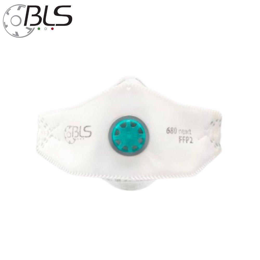 The BLS 680 NEXT FFP2 NR D is a flat, disposable filtering facepiece with a built-in exhalation valve, classified under the FFP2 protection standard and designed for single-shift use (NR), with the D marking indicating it passed the dolomite clogging test for high dust environments.