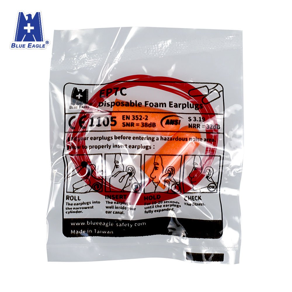 The Blue Eagle EP7C earplugs deliver robust noise protection, boasting an SNR of 39 dB and NRR of 32 dB. Crafted from soft, self-adjusting polyurethane foam, they offer excellent long-term comfort and ease of insertion thanks to their slow-recovery design. The vibrant orange color ensures high visibility for safety compliance, while the included cord adds practicality by reducing loss. Meeting EN 352-2 and ANSI S3.19 standards, the EP7C is thoughtfully packaged—1 pair per polybag, 200 pairs per inner box, and 2000 pairs per carton—and is manufactured in Taiwan.