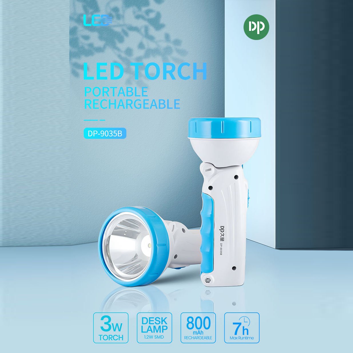 The DP-9035B LED Flashlight Torch with Side LED Desk Lamp is a versatile and rechargeable lighting solution combining a powerful handheld flashlight and a side desk lamp. Constructed with durable ABS and electronic components, it offers reliable illumination for outdoor activities, emergency lighting, home use, camping, and work tasks. The built-in rechargeable battery and plug-in charging design make this torch convenient and practical for everyday use.