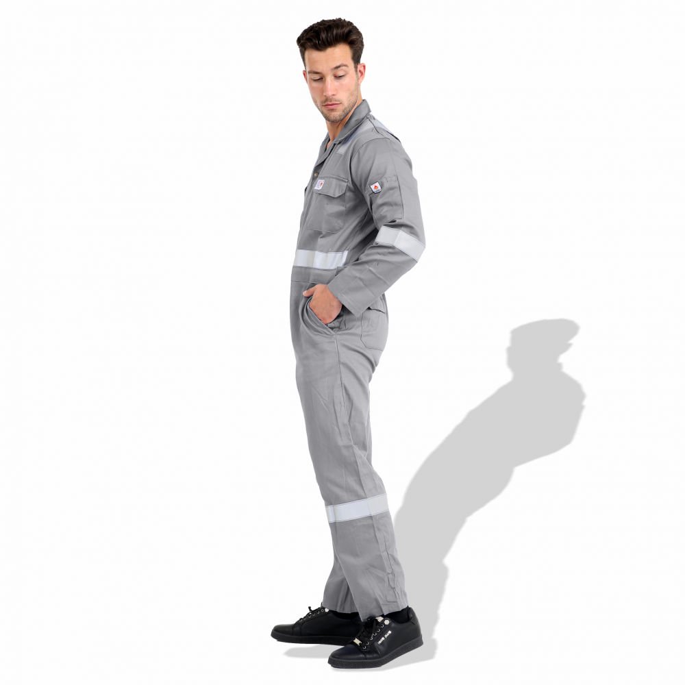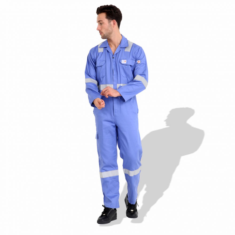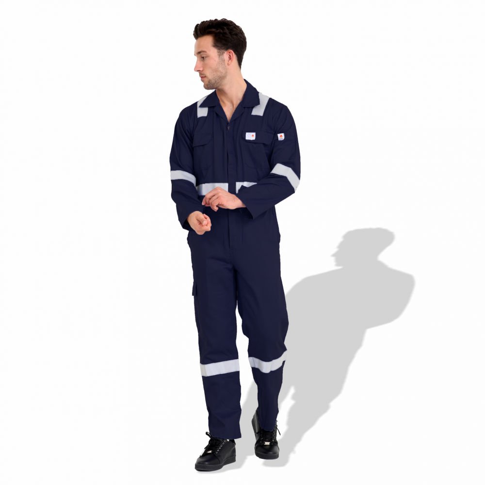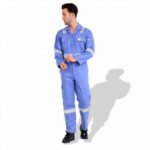 The F1023 coverall is a flame-resistant work uniform made from pre-shrink cotton, available in both 240 GSM and 300 GSM fabric weights according to requirement. It features 50 mm reflective tape for 360° visibility, reinforced stitching, multiple utility pockets, and options for color and logo customization. It’s suitable for industrial settings where fire resistance and high visibility are critical.