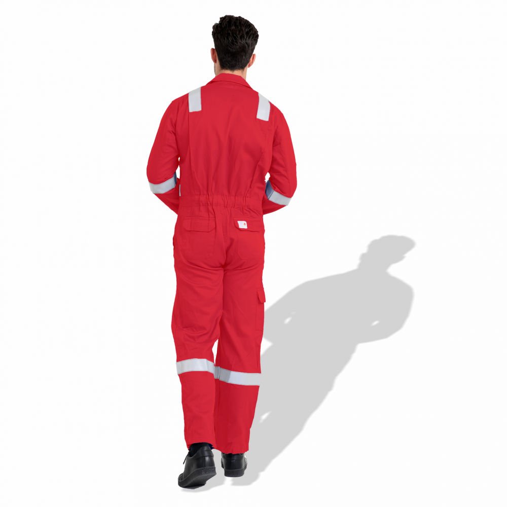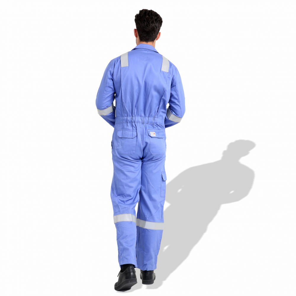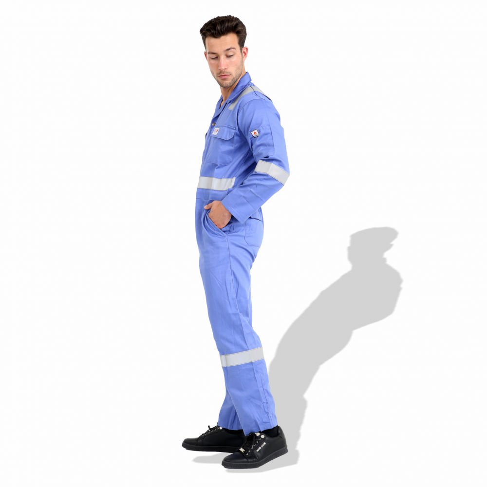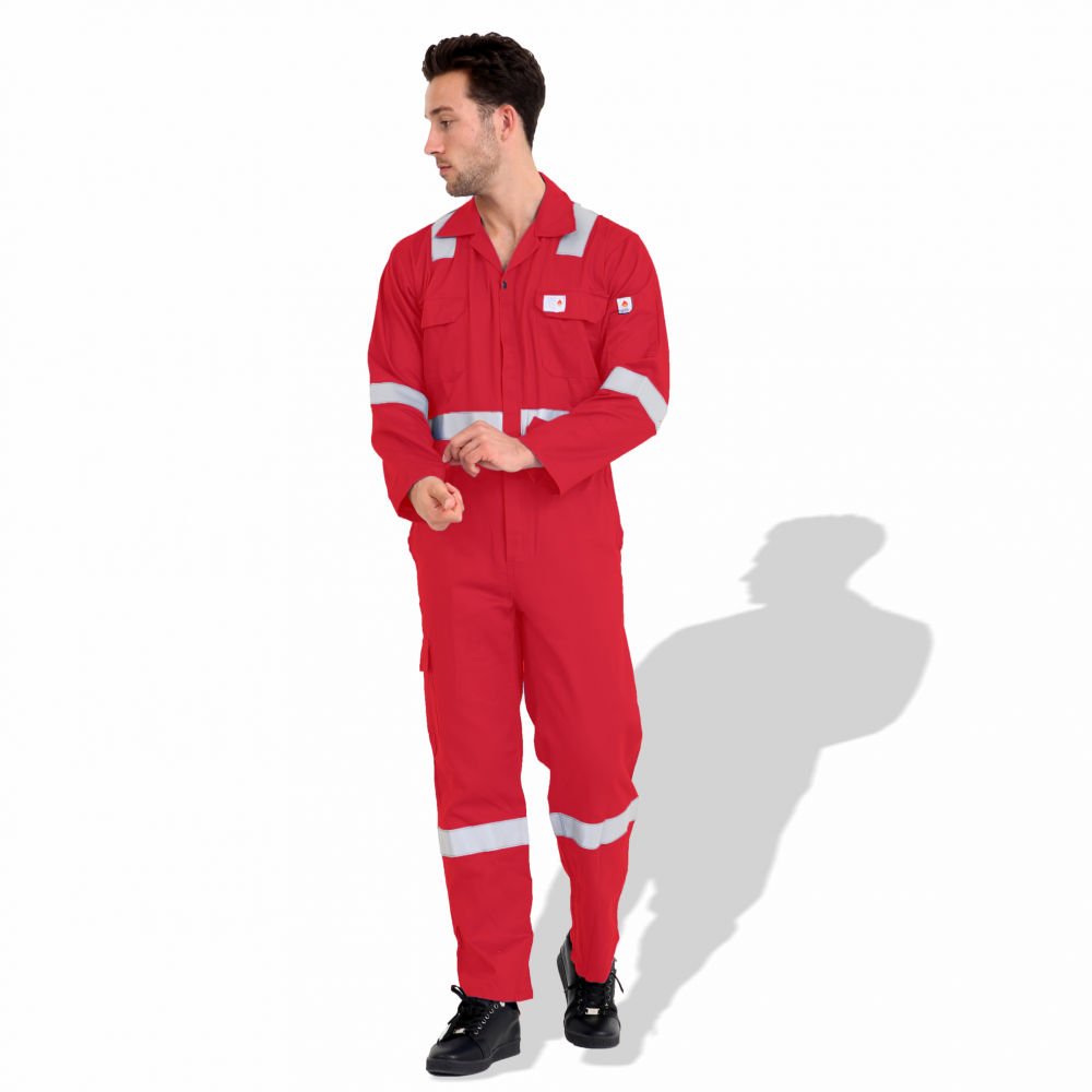 The F1023 coverall is a flame-resistant work uniform made from pre-shrink cotton, available in both 240 GSM and 300 GSM fabric weights according to requirement. It features 50 mm reflective tape for 360° visibility, reinforced stitching, multiple utility pockets, and options for color and logo customization. It’s suitable for industrial settings where fire resistance and high visibility are critical.