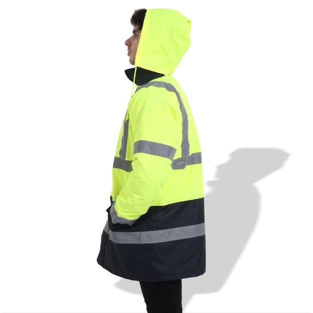 The Fluorescent Parka FP1653 is a high-visibility safety raincoat designed for roadwork, traffic control, and outdoor operations where both visibility and weather protection are critical. Made from waterproof polyester PVC with insulated lining and reflective safety elements, it keeps workers dry and visible in rain, low light, and challenging conditions.