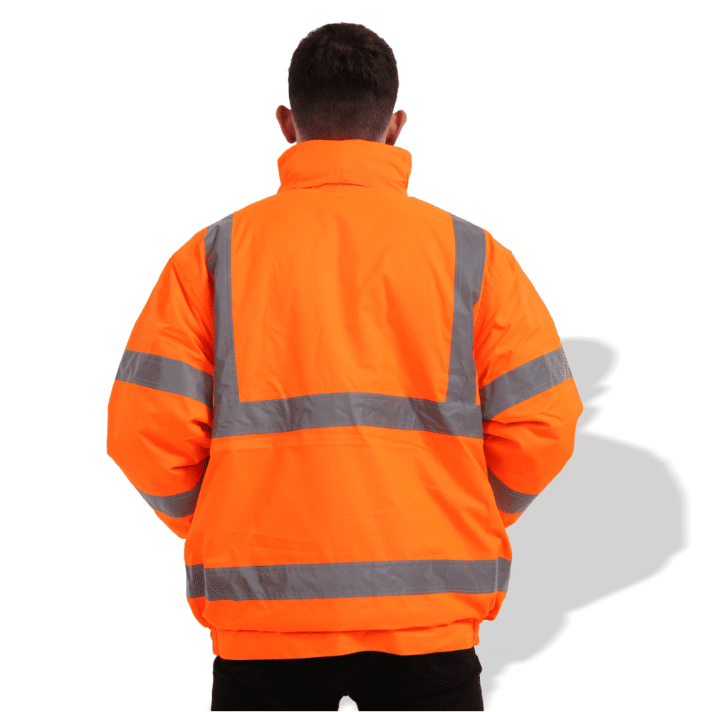 Fluorescent base color with gray reflective tape arranged for maximum visibility per EN471