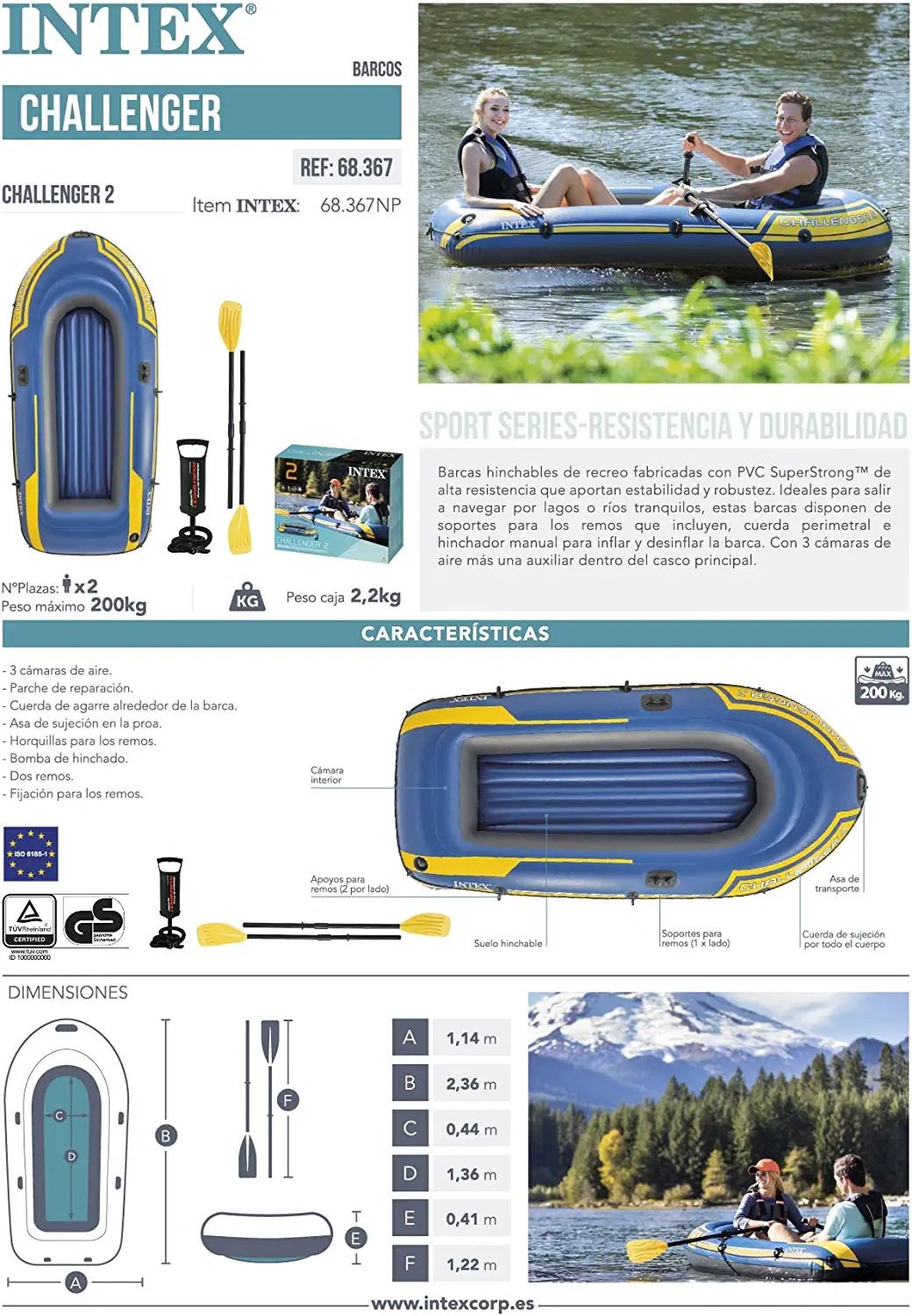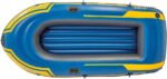 The Challenger 2 inflatable boat is perfect for two adults. Whether fishing, relaxing, or rowing on the lake, this boat is great for making your adventure exciting and entertaining. Designed with heavy duty, puncture resistant PVC for comfort and durability, and an inflatable I-beam floor for rigidity, the boat contains three air chambers including an inner auxiliary chamber inside the main hull for extra safety. Inflating and deflating is a breeze with two quick-fill Boston valves. A grab handle on the bow and an all-around grab line are provided for your convenience, as well as welded oar locks, oar holders and a repair patch kit. Also included are two 48 inch French oars and an Intex high-output pump for inflating and deflating.