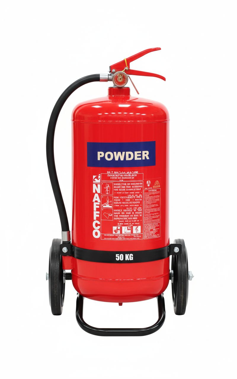 The Naffco NTP50 is a 50 kg dry chemical powder fire extinguisher (ABC-type) mounted on a wheeled trolley for easier mobility. It’s built with a hot-rolled steel plate cylinder and rugged trolley frame, fitted with a 5 m hose (16 mm bore) and lever-operated brass valve. Designed for fire classes A, B, C (combustible solids, flammable liquids, electrical), it has a discharge time of ~ 47-55 seconds and effective throw range of 7-9 meters. It operates safely between −20 °C to +60 °C, with working pressure ~ 18 bar, tested to 32 bar. Total height ~ 1065 mm × width ~ 550 mm, gross weight ~ 100 kg.