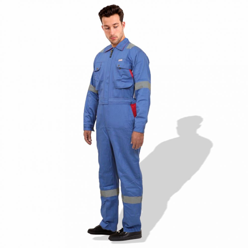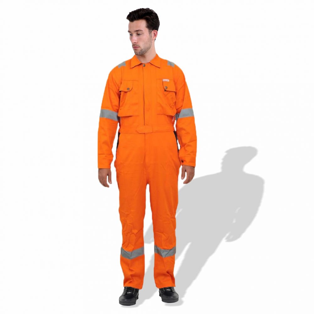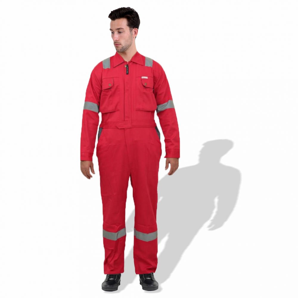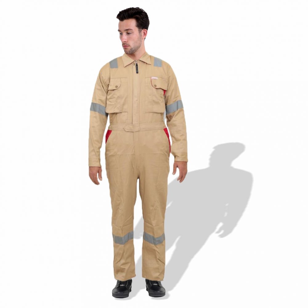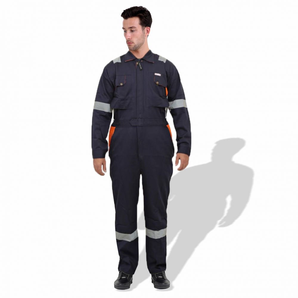 The D592 Doha Coverall is a high-visibility safety garment made from 100% pre-shrunk cotton fabric at 240 GSM, offering durability with comfort. It features 50 mm grey reflective tape on critical areas such as knees, shoulders, sleeves, and guards to enhance visibility. The front has a full-length metal zipper concealed with a placket. Designed with multiple pockets (including chest and back) and elasticized waist sides, it’s sized S to 5XL, and offered in several base colours (Red, Dark Blue, Beige, Light Blue, Orange, Grey). Complies with EN 340 standards for safety/workwear quality. Ideal for industrial, construction or field-work uses where both visibility and breathability are required.