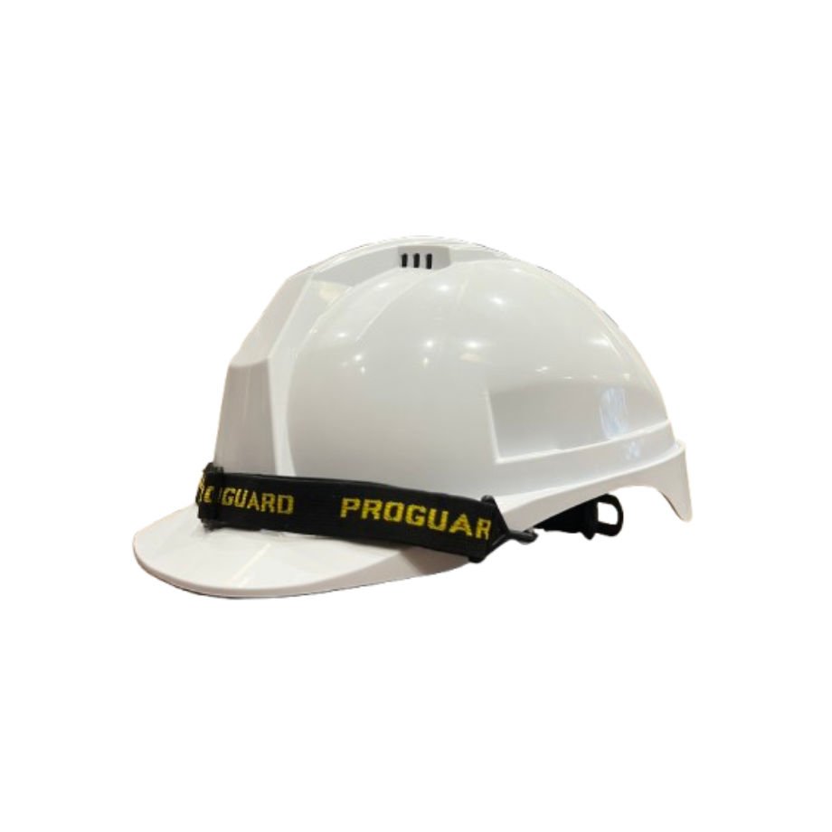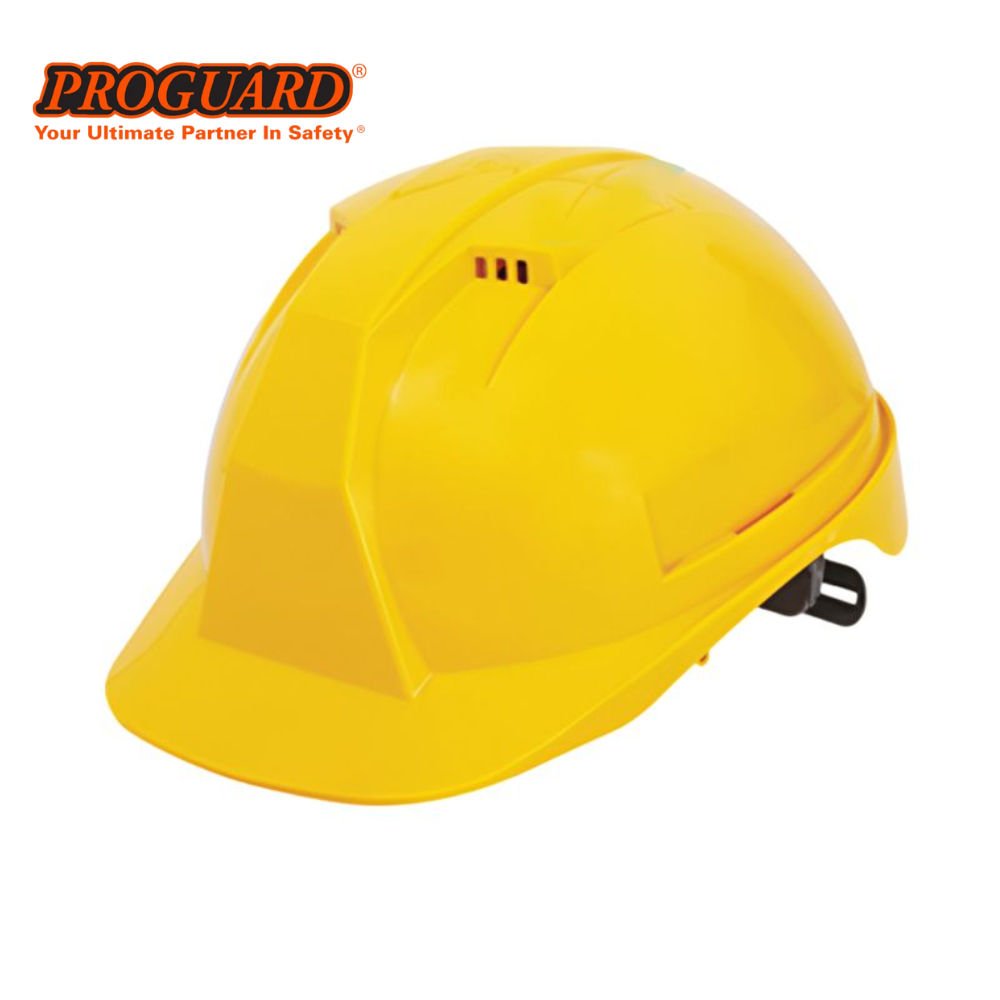 The Proguard OPTIMUS 11 safety helmet features a modern ventilated design with front cooling vents to reduce heat buildup, enhancing wearer comfort during extended use. The helmet utilizes a swivel ratchet adjustment system for a secure and customized fit, and its side slots support attachment of compatible Proguard accessories for versatile industrial applications.