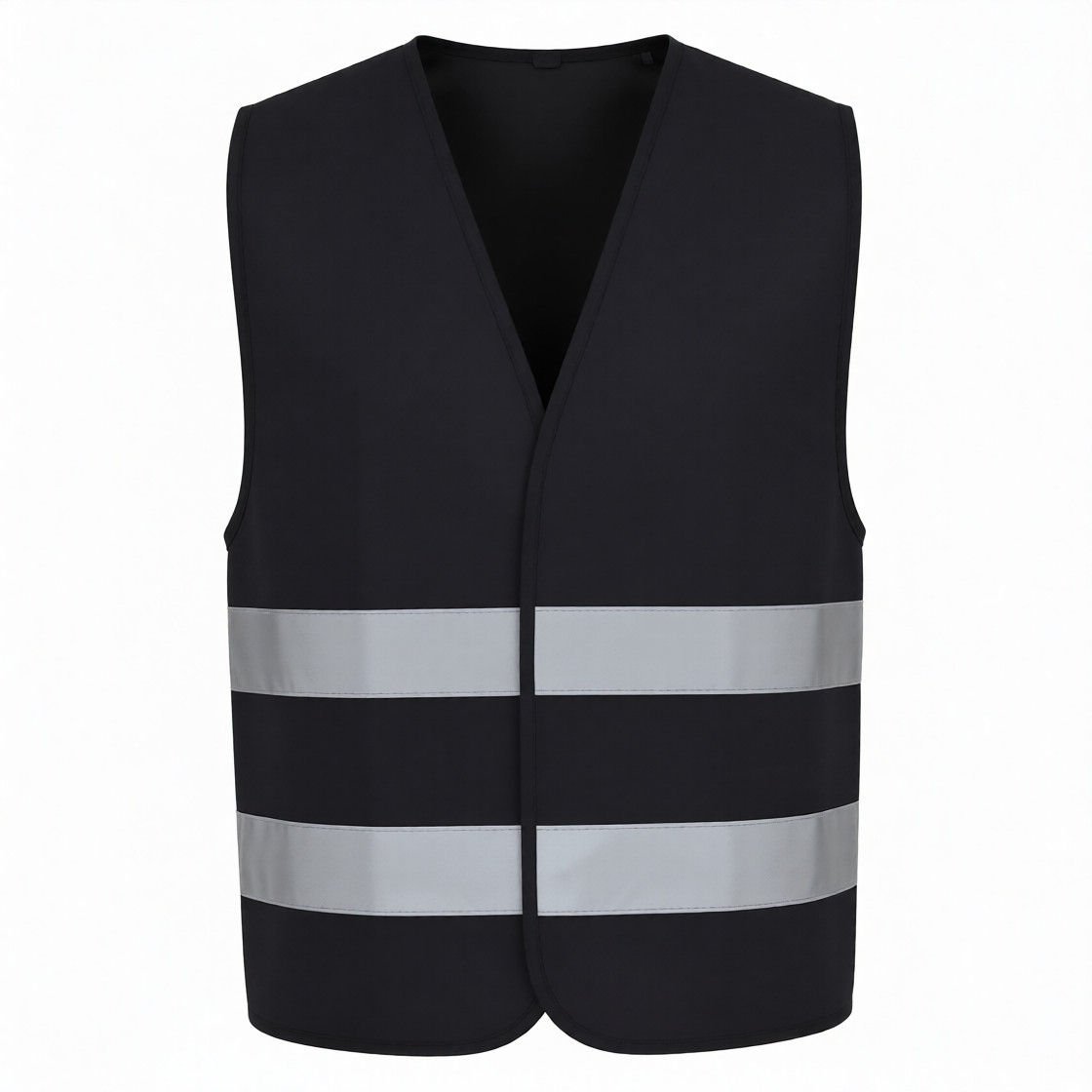 A high-visibility safety vest crafted from 120 GSM polyester in black, designed for use in environments where dark or neutral tones are preferred but safety visibility must be maintained. It includes 360° reflective striping to enhance visibility in low light or night conditions. The vest is pocketless and uses a Velcro open front closure for ease of wear. Standard sizing is used, and custom logos or branding can be added on request.