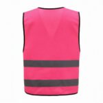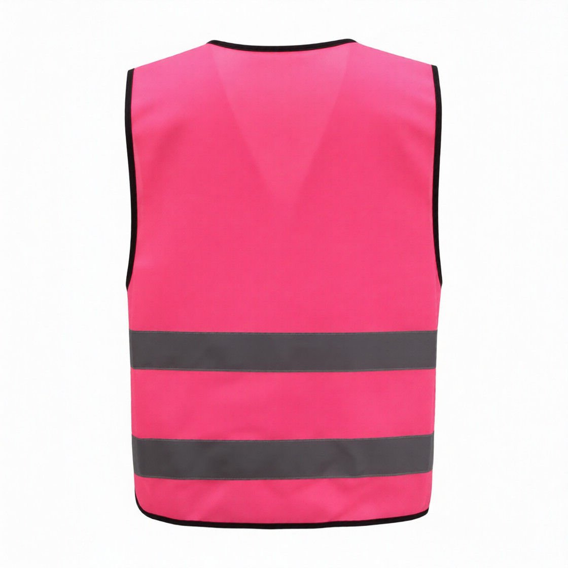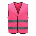 This pink high-visibility safety vest is made from 120 GSM polyester, designed without pockets to maintain a sleek and safe profile. It features 360° reflective striping for visibility in low light or nighttime environments, and uses a Velcro open-front closure for easy wear. The sizing is standard (universal range), and there is an option to add a custom logo or branding when ordering.