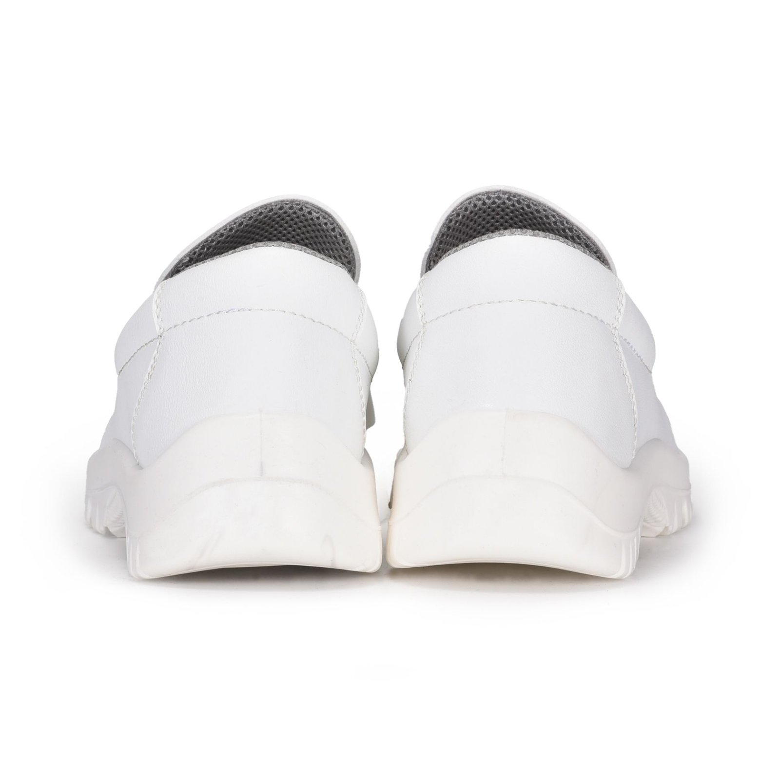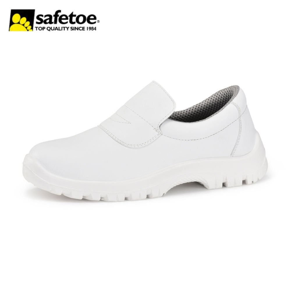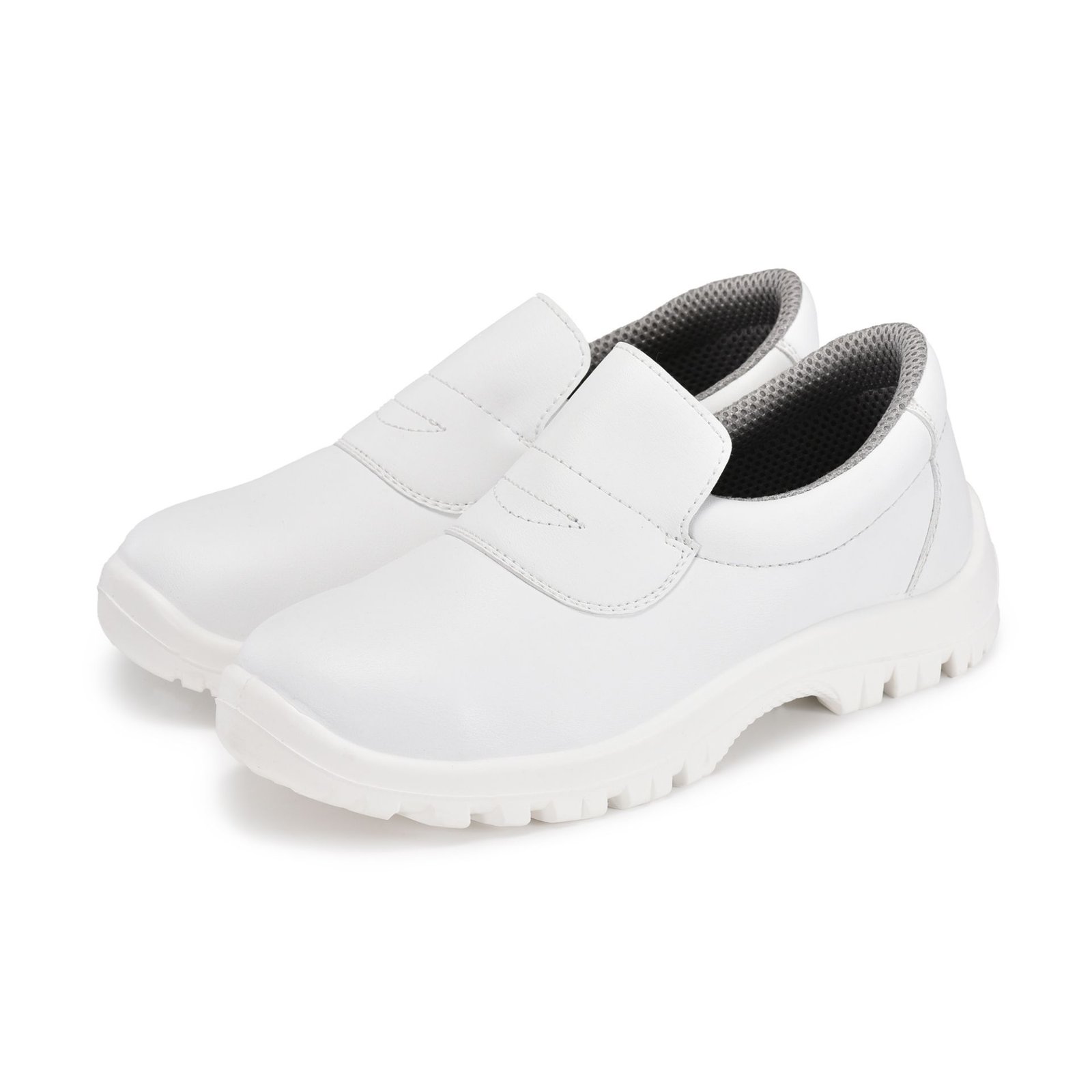 These food industry safety shoes are handmade from smooth white microfiber PU, designed for hygienic environments where easy cleaning and non shedding materials are essential. They feature a protective toe cap, anti static construction and a slip resistant PU sole, making them ideal for kitchens, food processing plants, laboratories and cleaning work.