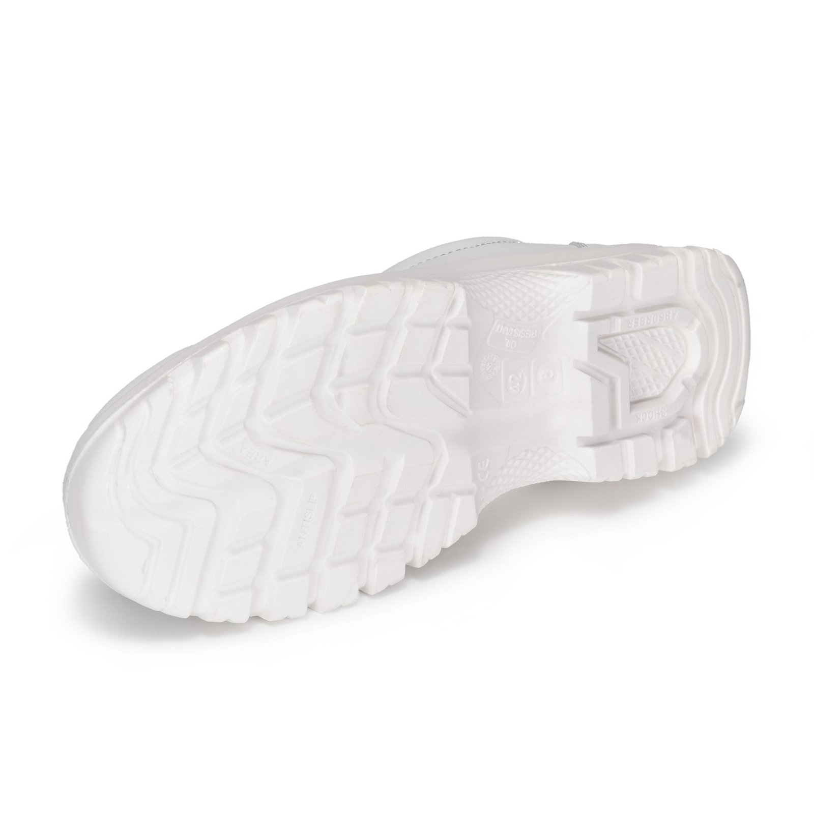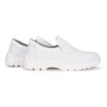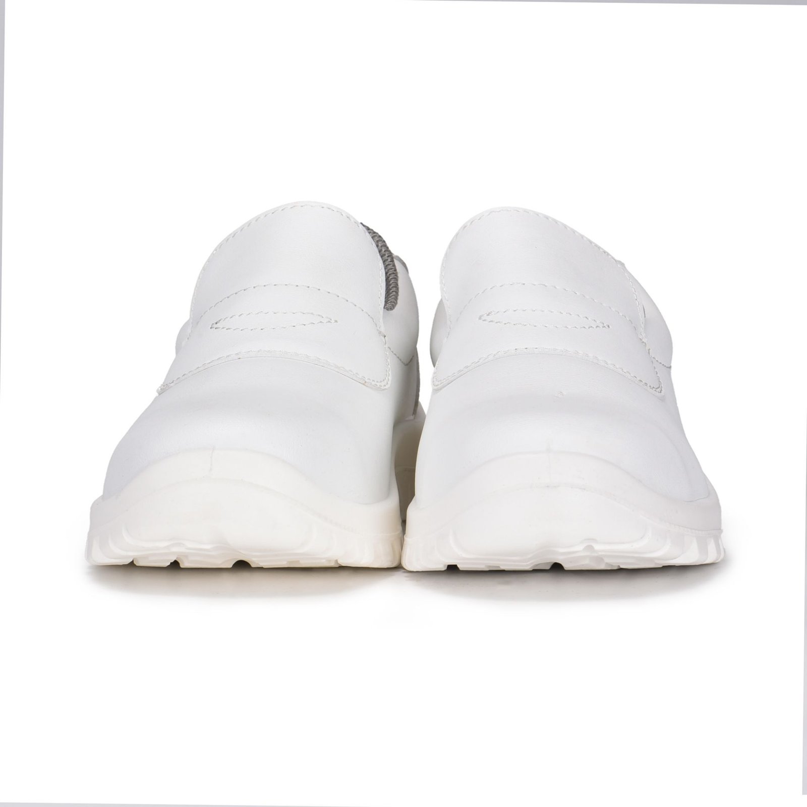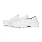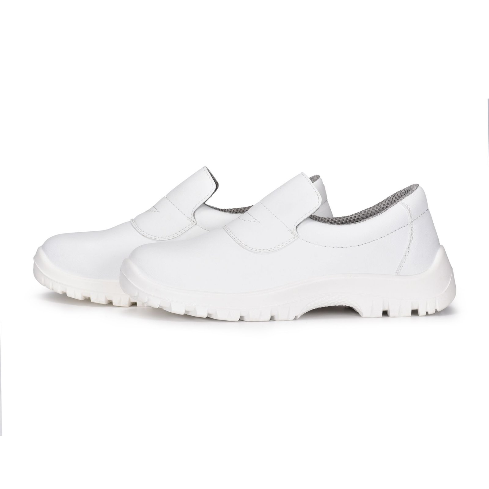 These food industry safety shoes are handmade from smooth white microfiber PU, designed for hygienic environments where easy cleaning and non shedding materials are essential. They feature a protective toe cap, anti static construction and a slip resistant PU sole, making them ideal for kitchens, food processing plants, laboratories and cleaning work.