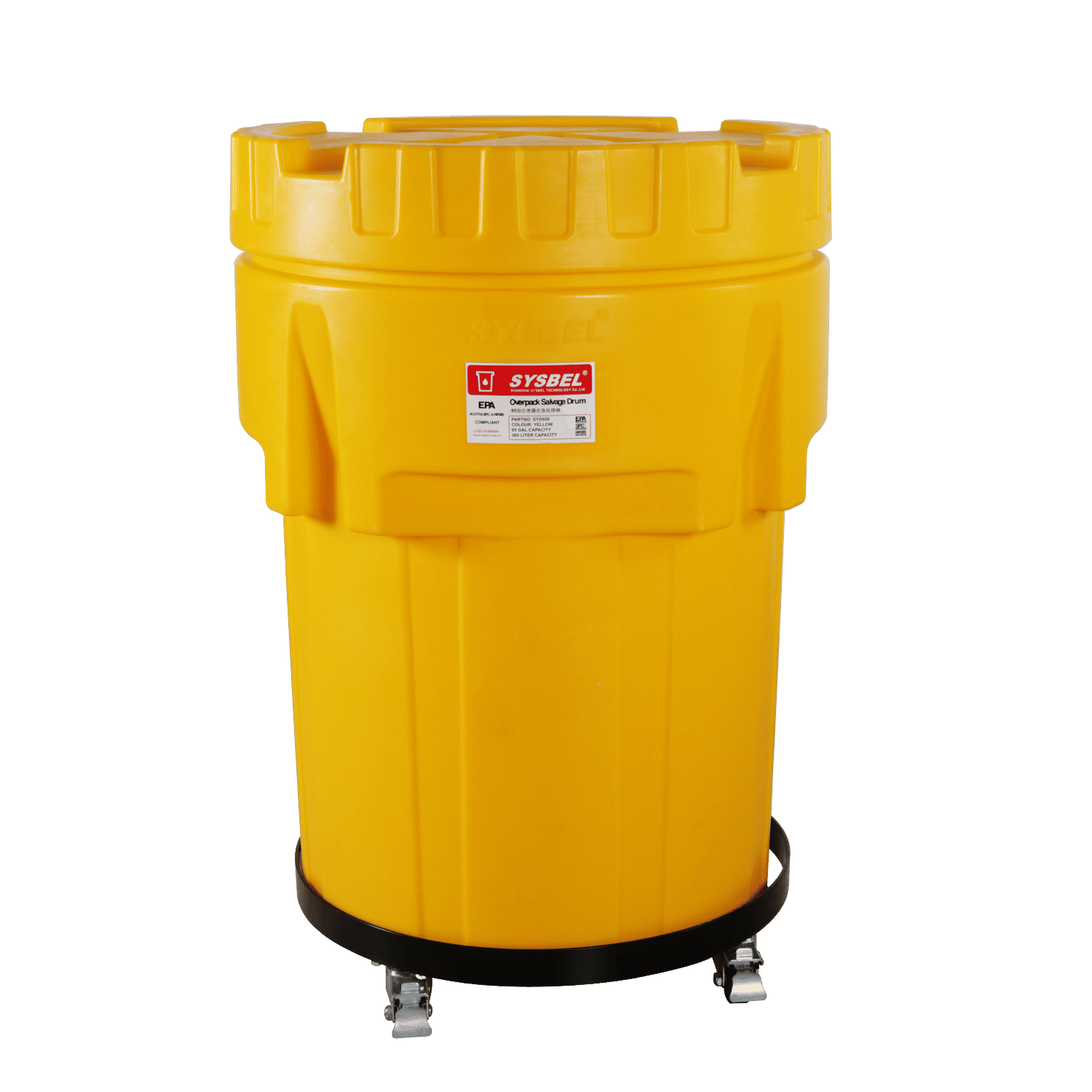 The SYSBEL SYD001 steel dolly is a rolling cart designed to support large overpack salvage drums (typically 95 gallons) used in chemical or oil spill emergency kits. By placing a drum on this dolly, you can easily move heavy, filled salvage drums — making spill response faster and safer. The dolly uses sliding rails and universal casters to allow smooth mobility while preventing bounce during operations