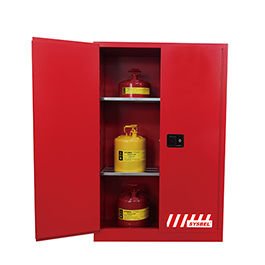 WA810450R is a combustible cabinet for storing paints, oil, and other flammable liquids (high flash point ≥37.8 °C). Suitable for coating, printing, furniture, automotive, and other industries. Its double‑wall steel body with insulating air space enhances fire resistance. The cabinet includes two adjustable heavy‑duty shelves (100 kg each), suitable for storing multiple containers. Double‑door access allows easy loading/unloading, and powder‑coated, corrosion‑resistant finish ensures long-term durability. The built-in leak sump catches spills or drips, ensuring safe storage.