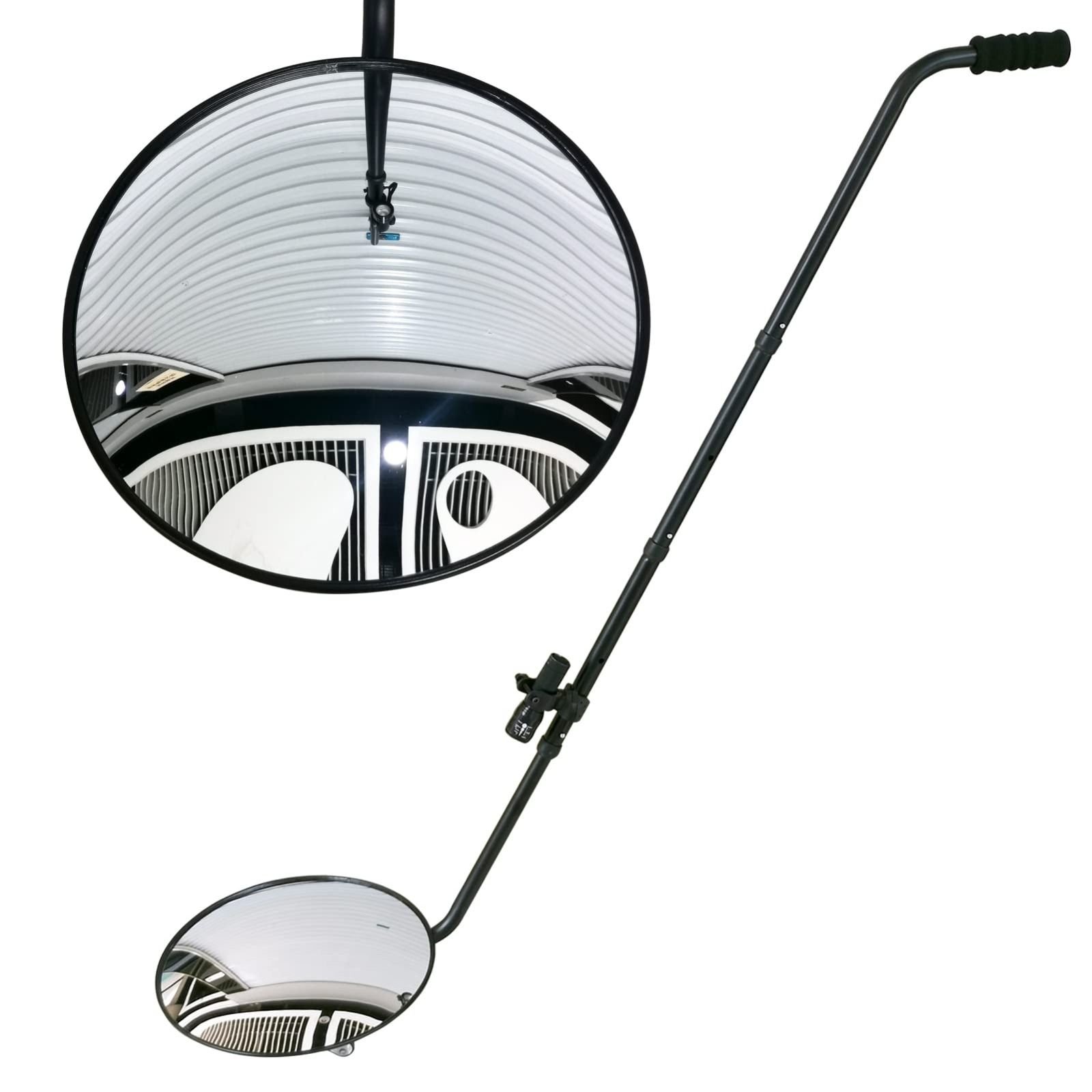 This inspection mirror is designed for security and vehicle safety applications. It features a 12-inch flat acrylic mirror for wide-angle under-vehicle inspection, an extendable handle (from 42 inches to 51 inches) made of galvanized steel, and a weather-resistant polyethylene mirror backing. Wheels (casters) for easy mobility. Colour is listed as black. This system allows security personnel to examine the underside of vehicles in areas like parking garages, checkpoints and service entrances.